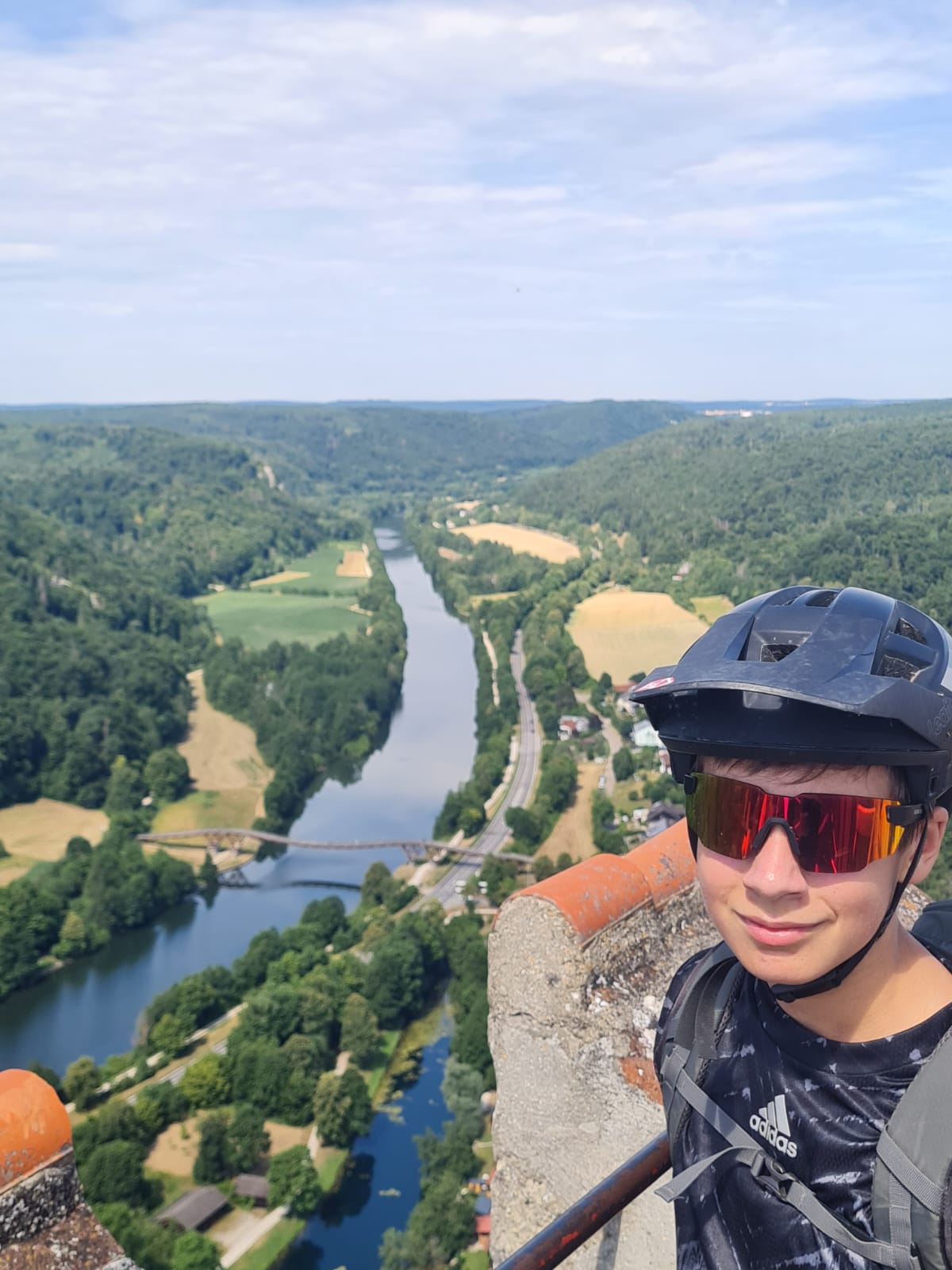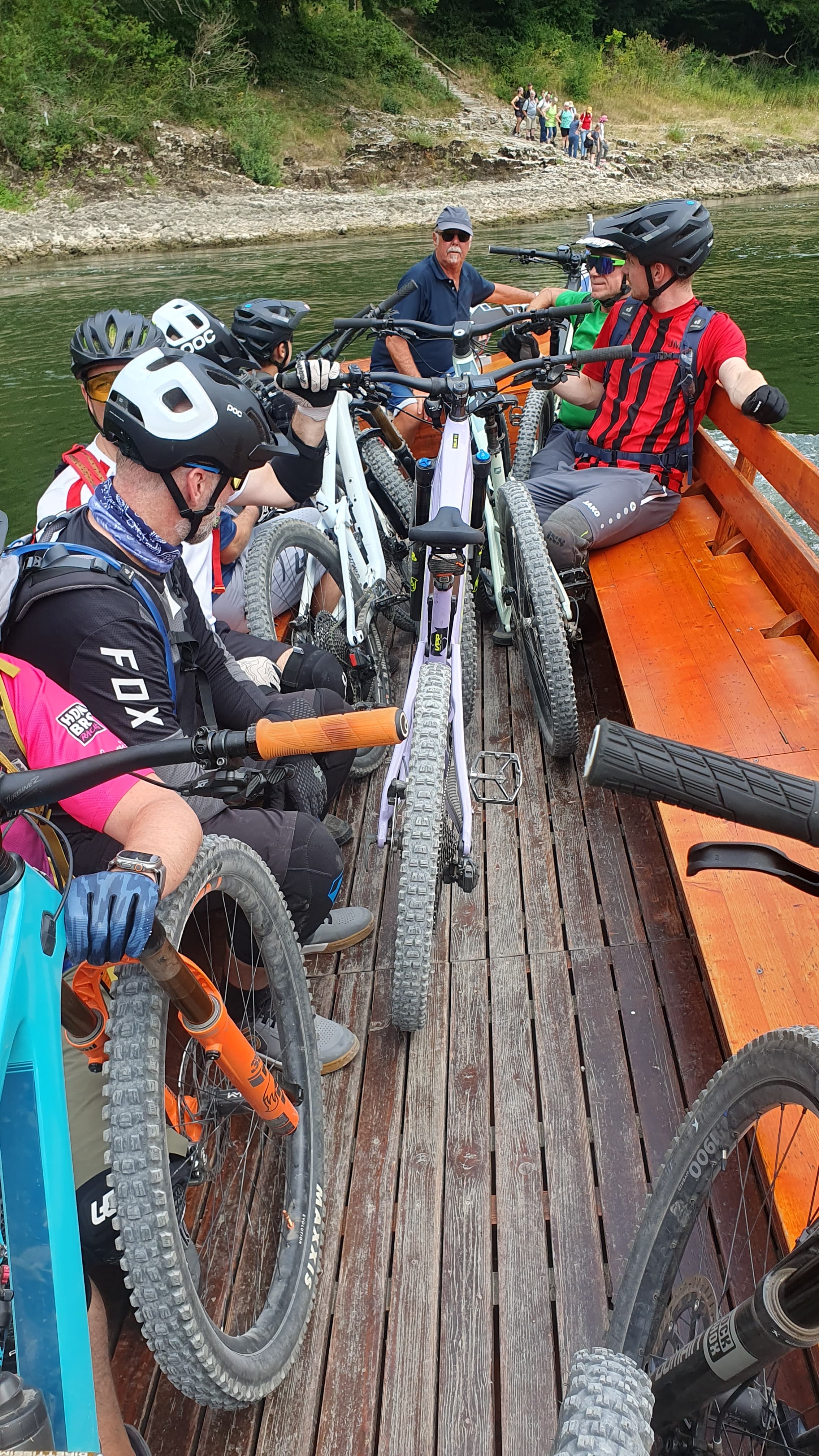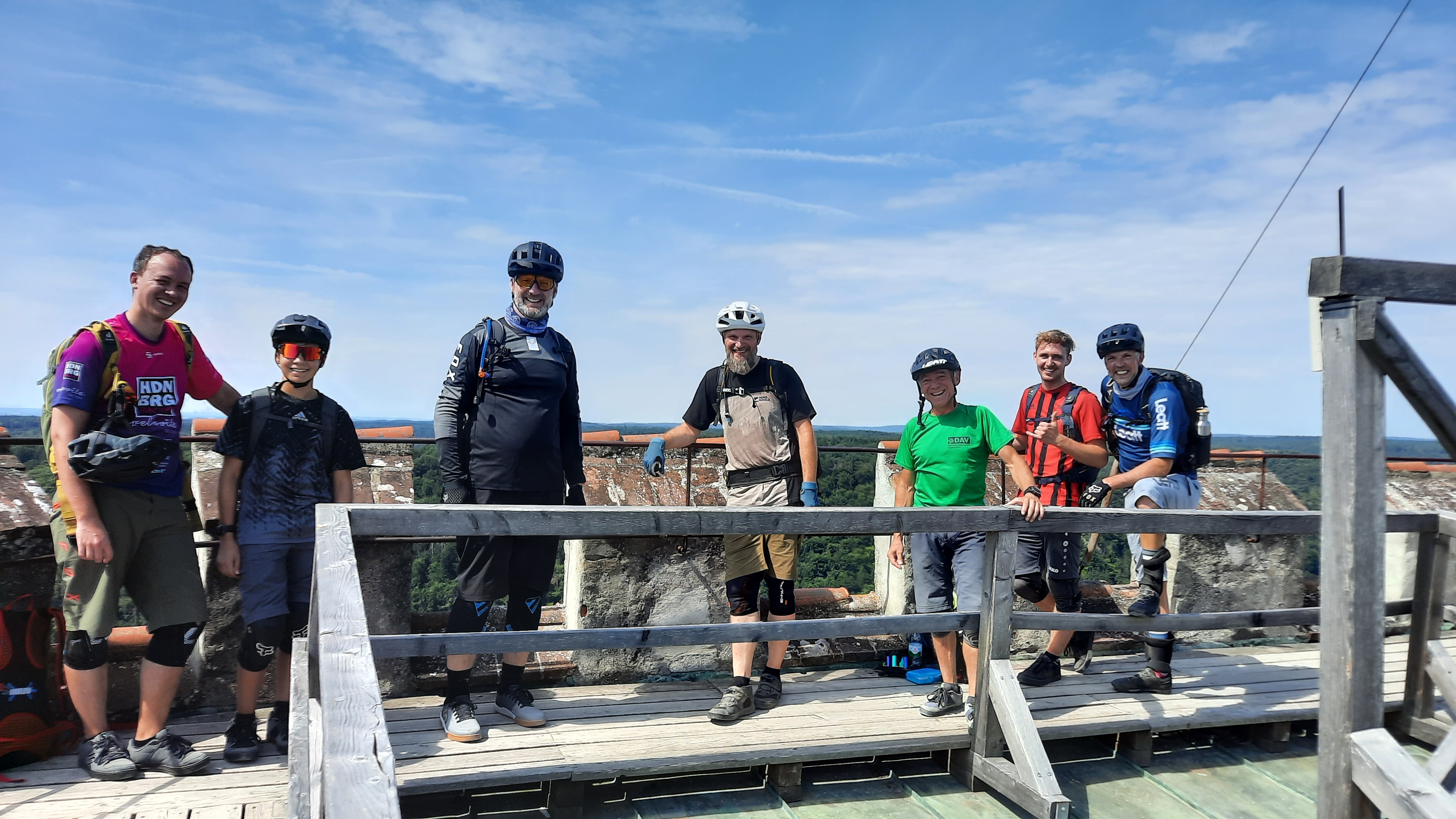 Nach kurzem Verschnaufen kam die Gruppe, auf einem coolen MTB-Trail entlang des Hangs, runter bis nach Prunn. Wir folgten dem Altmühltal-Radweg am Kanal bis nach Essing. Hier warteten auf uns schon die nächsten Wege nach oben. Anfangs wieder über Straßen anschließend über Waldwege und Uphills kamen wir zur Burg Randeck. Vom Burgturm aus hatten wir einen erstklassigen Ausblick auf das Altmühltal sowie den Tatzelwurm, die 193 Meter lange Holzhängebrücke, welche noch immer zu den längsten ihrer Art in Europa zählt. Der angenehme Wind dort oben tat ein übriges um die schöne Aussicht genießen zu können.