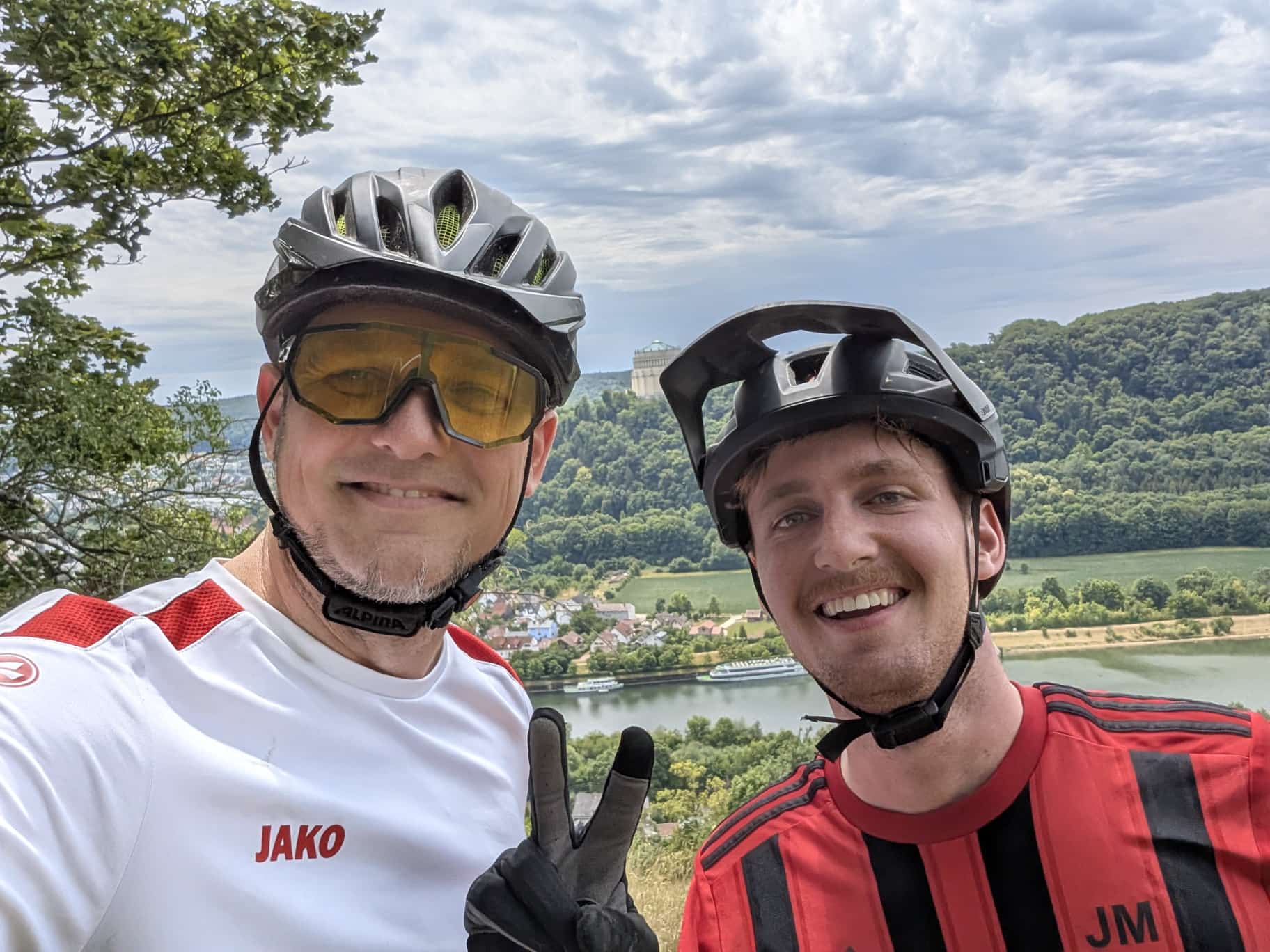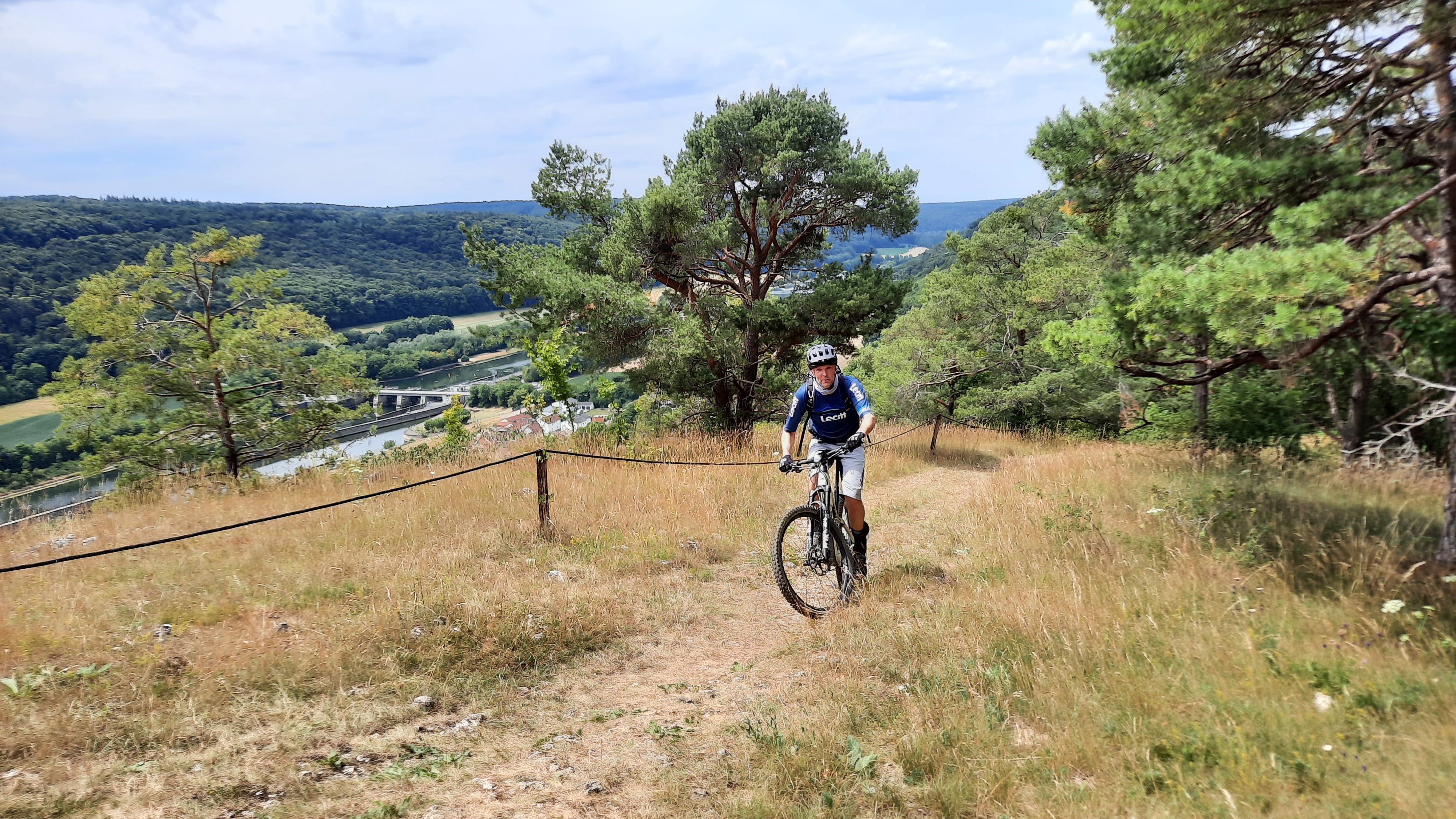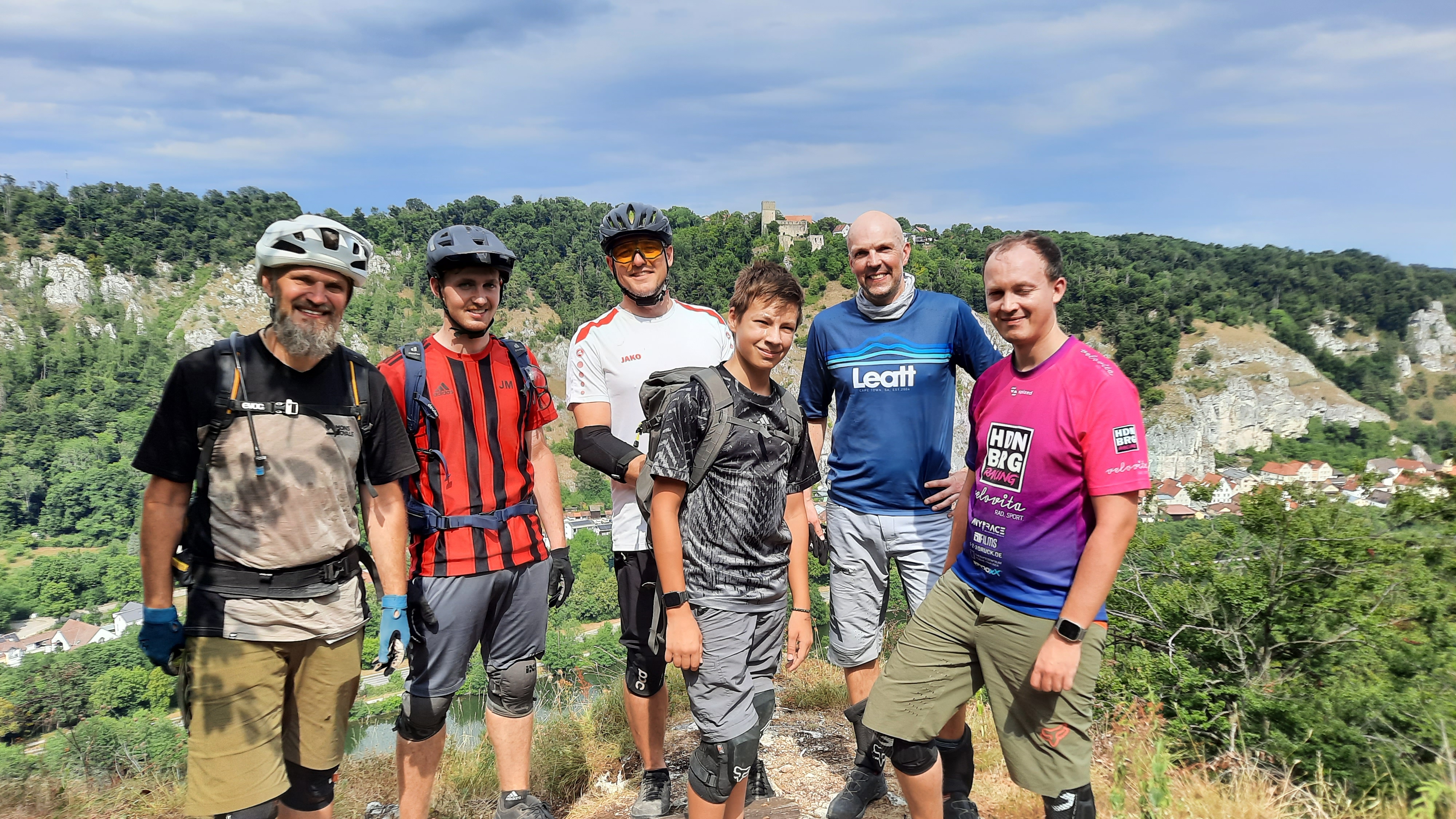 Frisch gestärkt ging es erneut hoch, am Etzerbichl und der Waldkapelle Essing vorbei, zur gegenüber liegenden Seite von Burg Randeck. Auch hier blieb uns ein schöner Blick, inkl. „Gipfelkreuz“, ins Altmühltal nicht verwehrt, diesmal jedoch von der anderen Seite. Nach einer letzten, tollen Abfahrt radelten wir auf verschiedenen Wegen und engen Pfaden neben dem Kanal zurück nach Riedenburg, hoch zu unserem Startpunkt der Rosenburg.