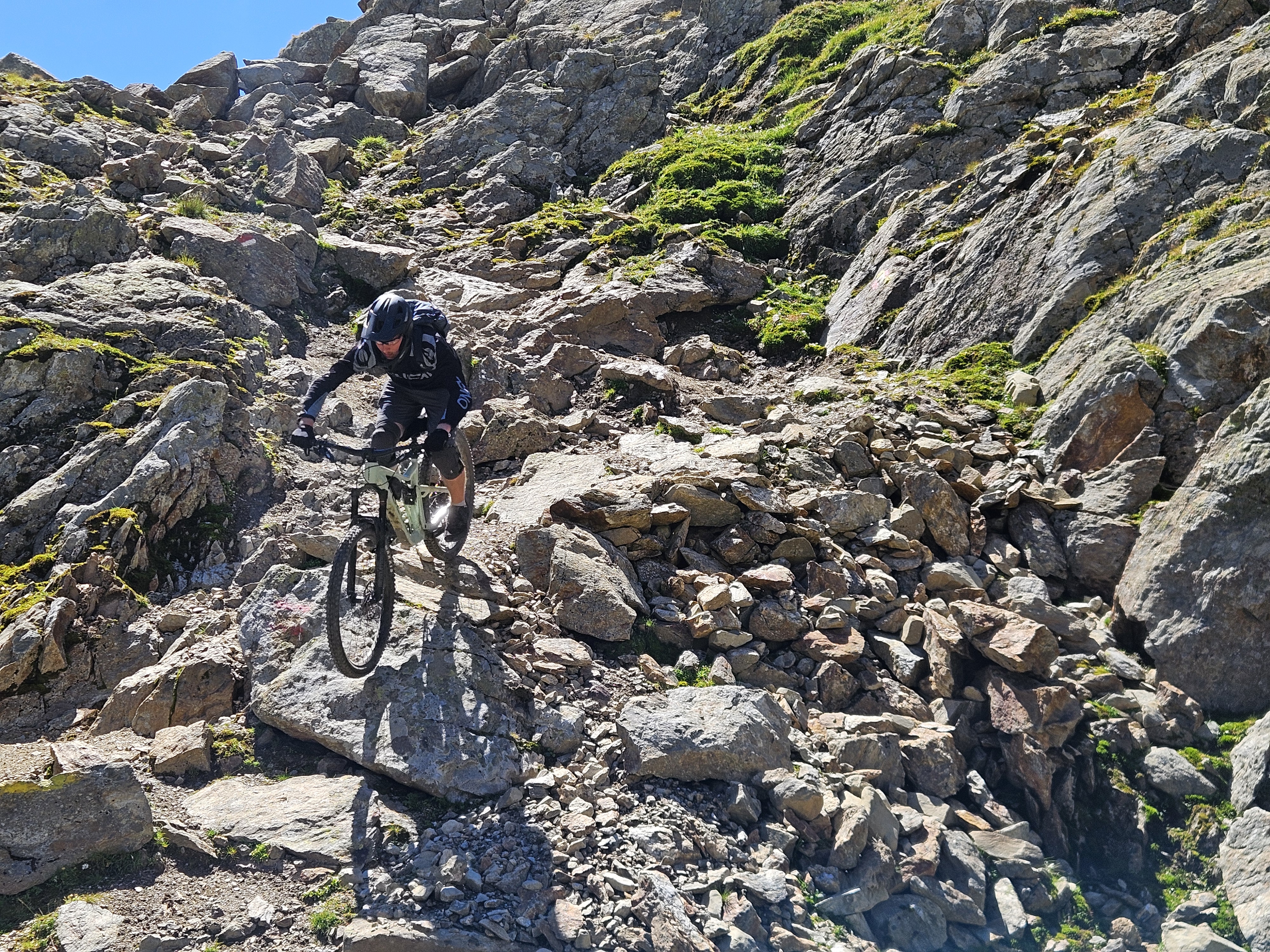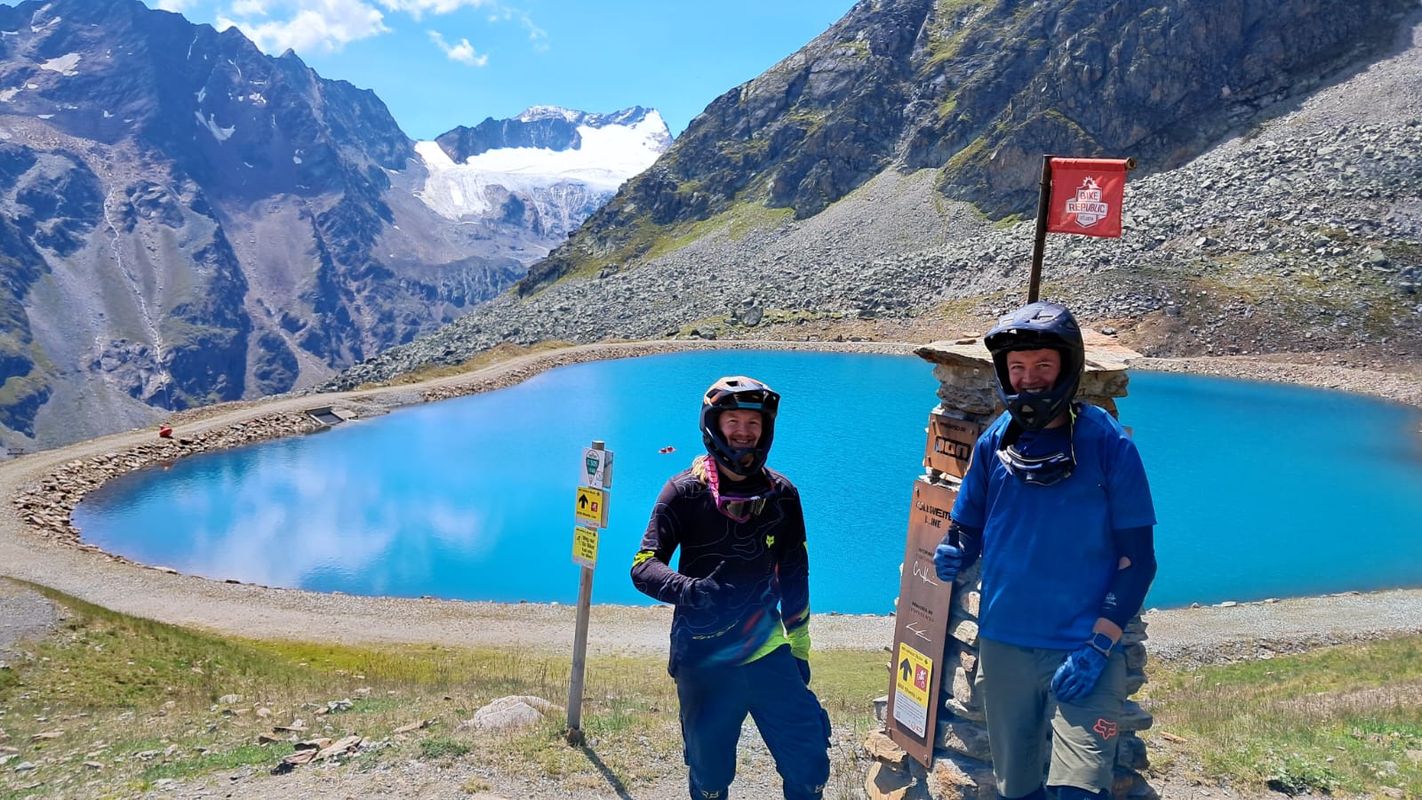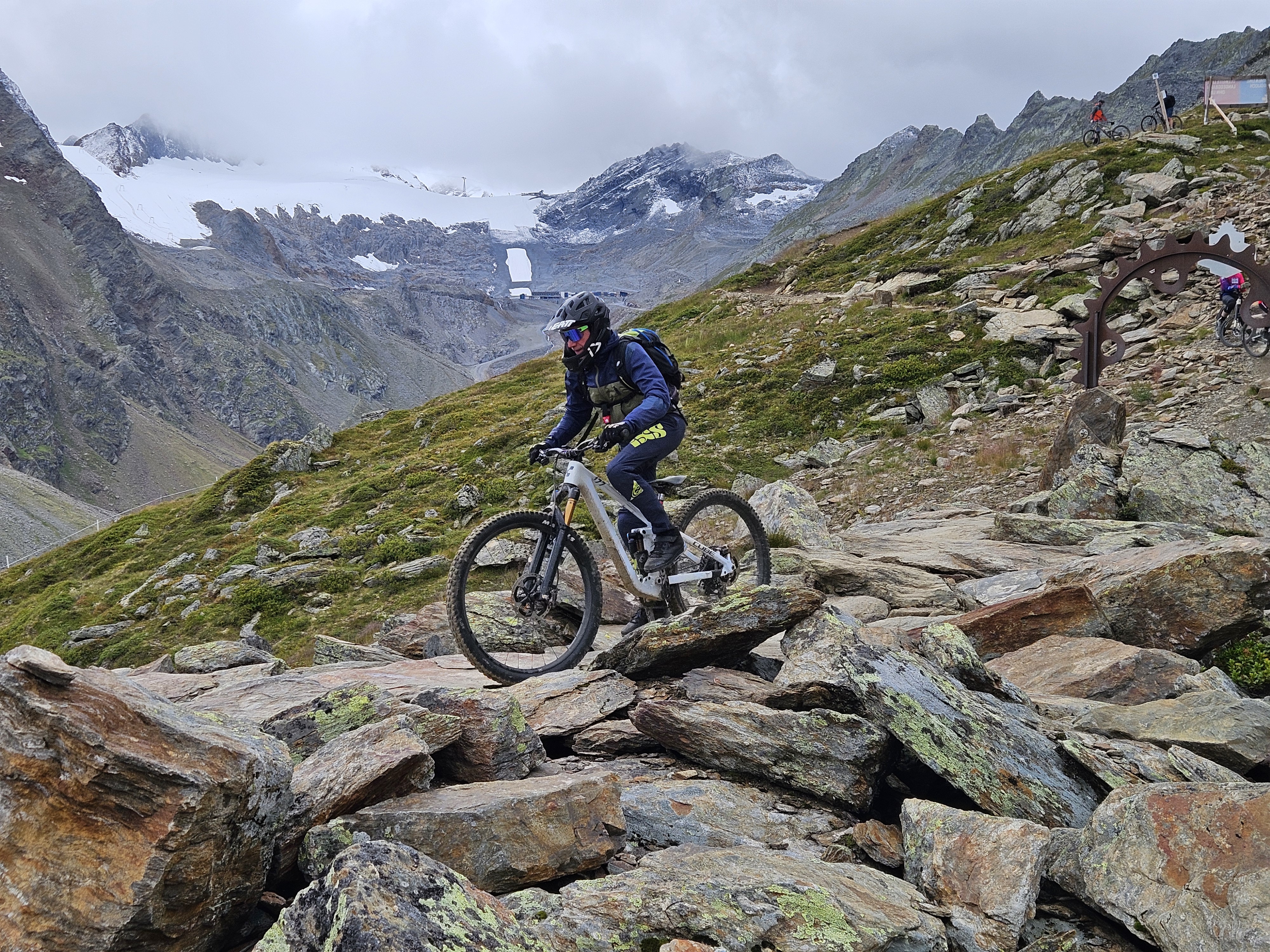 Als letztes Highlight der Woche stand noch der Fernar-Tail mit einer grandiosen Aussicht auf den Tiefenbachgletscher an. Das tiefschwarze Spektakel welches viel technisches Geschick und hohe Konzentration voraussetzt startet auf 2.800 Meter über N. N., führt extrem steil, über zahlreiche Spitzkehren und verblockten Stellen S4/S5 und entließ uns unversehrt wieder im Bikepark zur gemütlichen Einkehr, bevor die letzten Trails der Woche unsicher gemacht wurden.