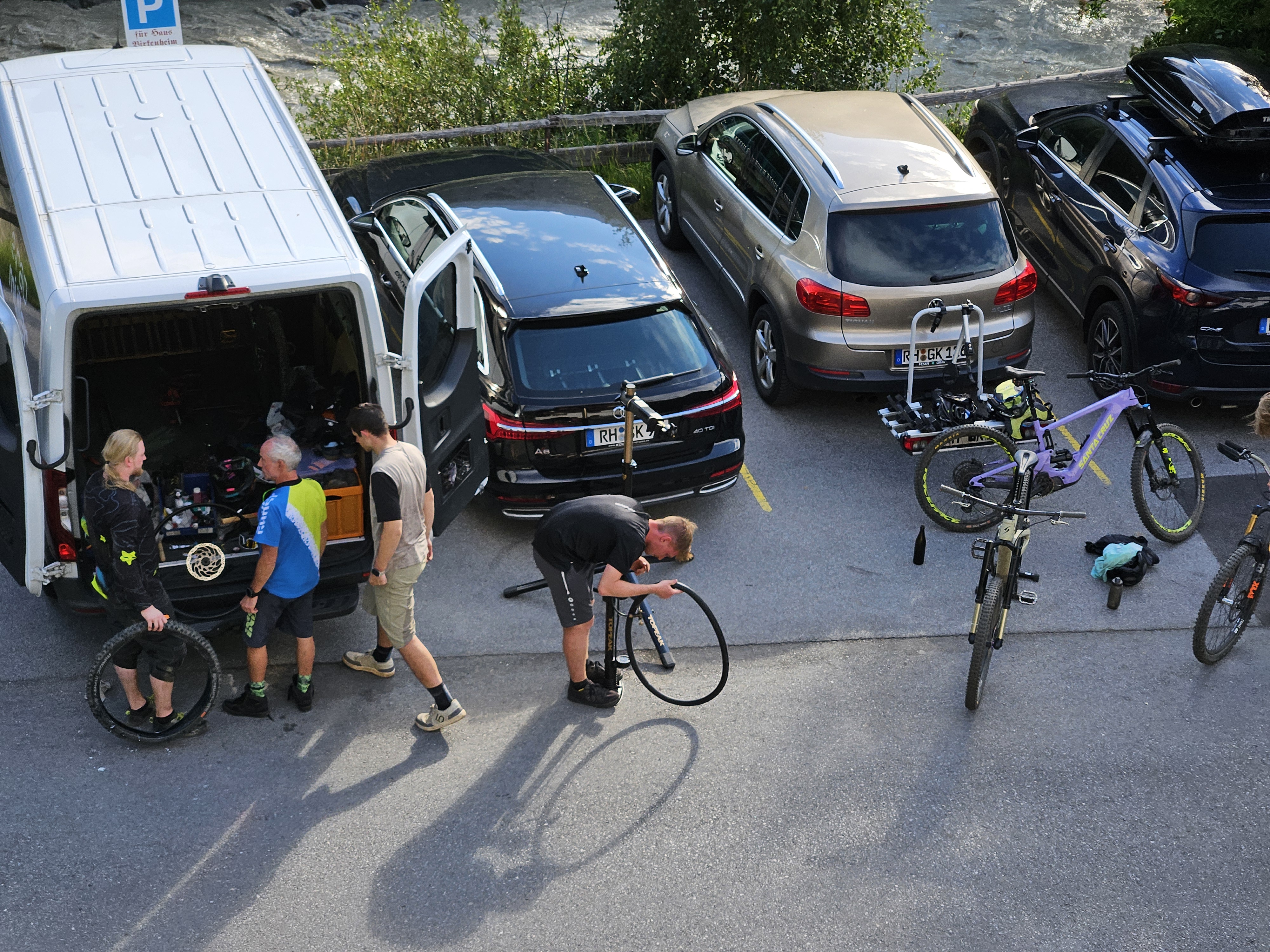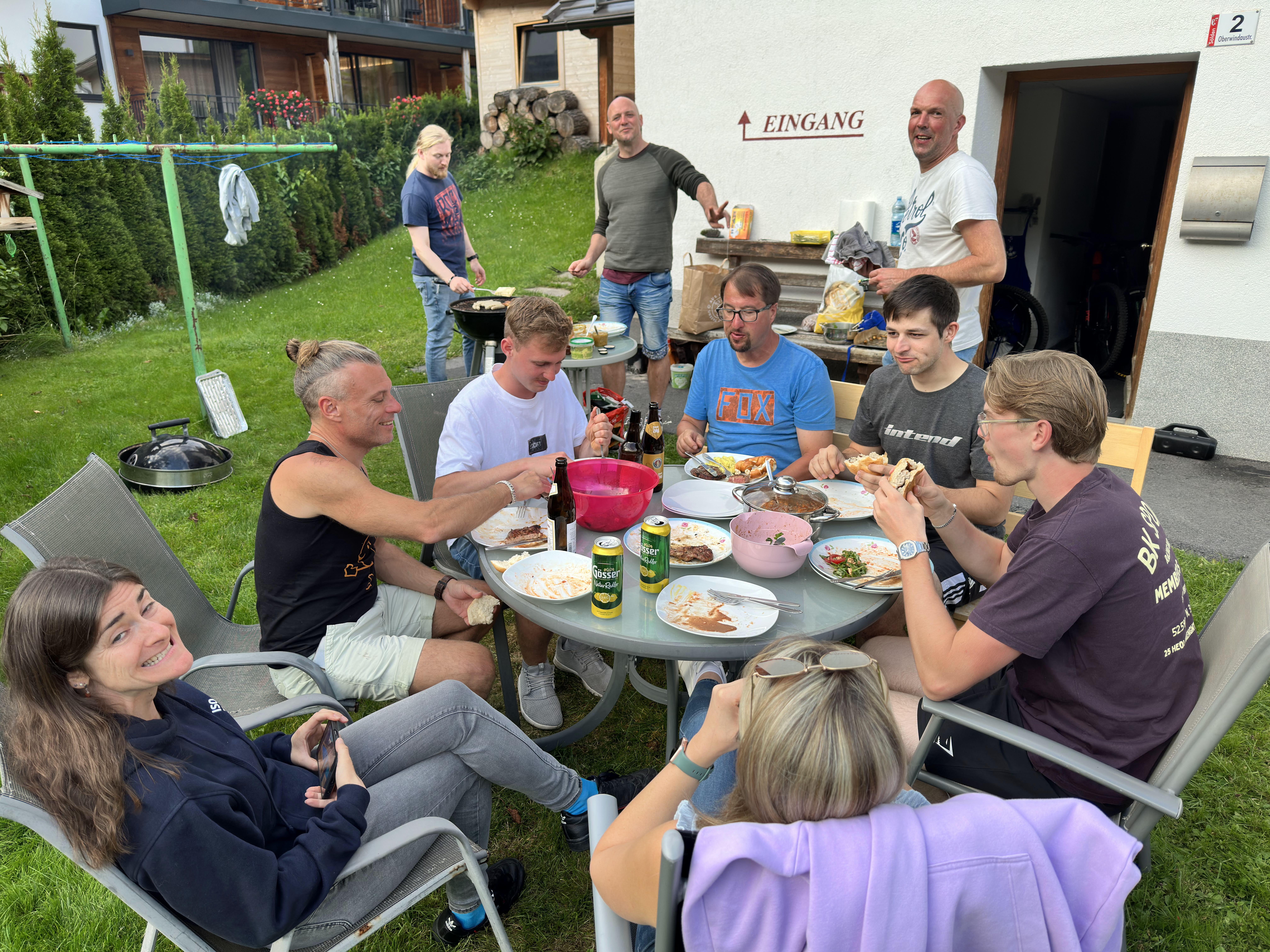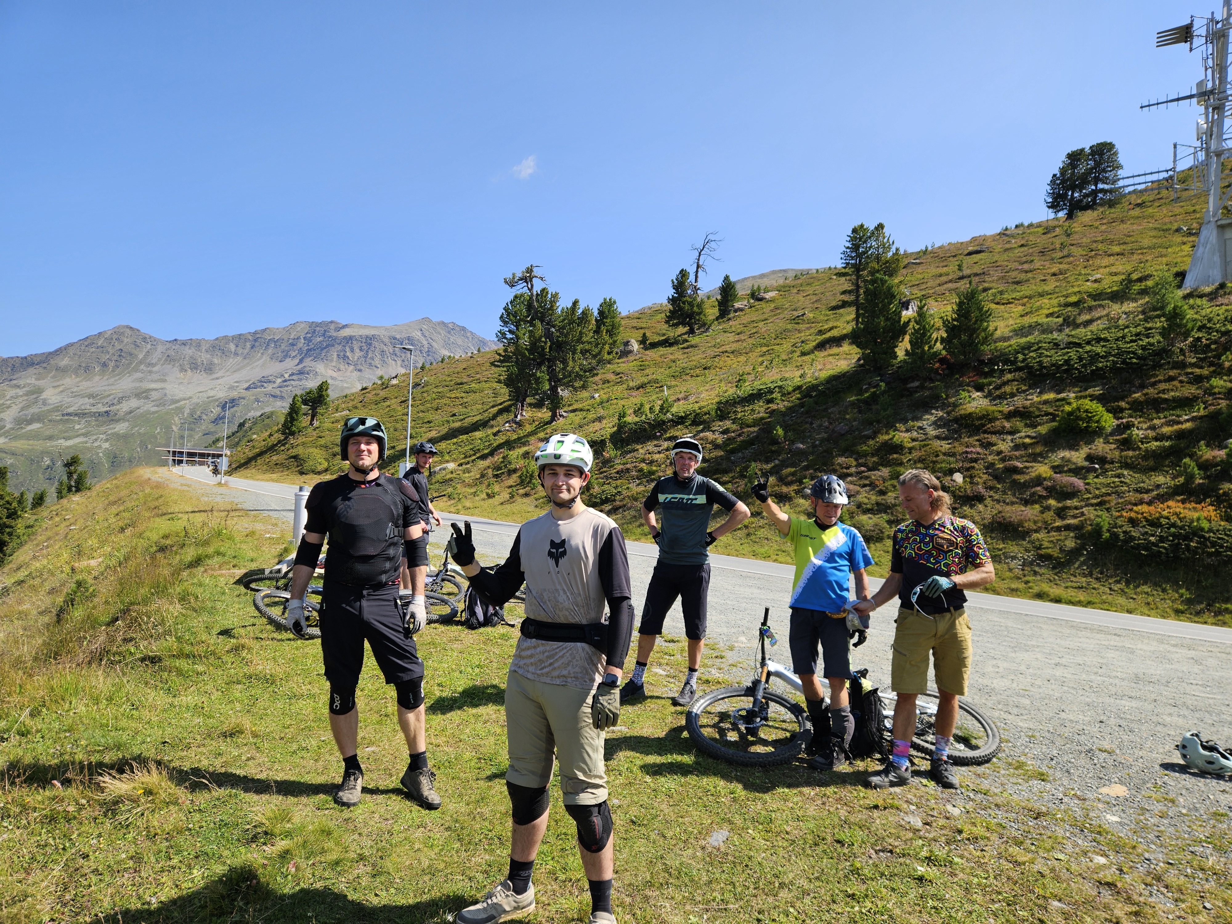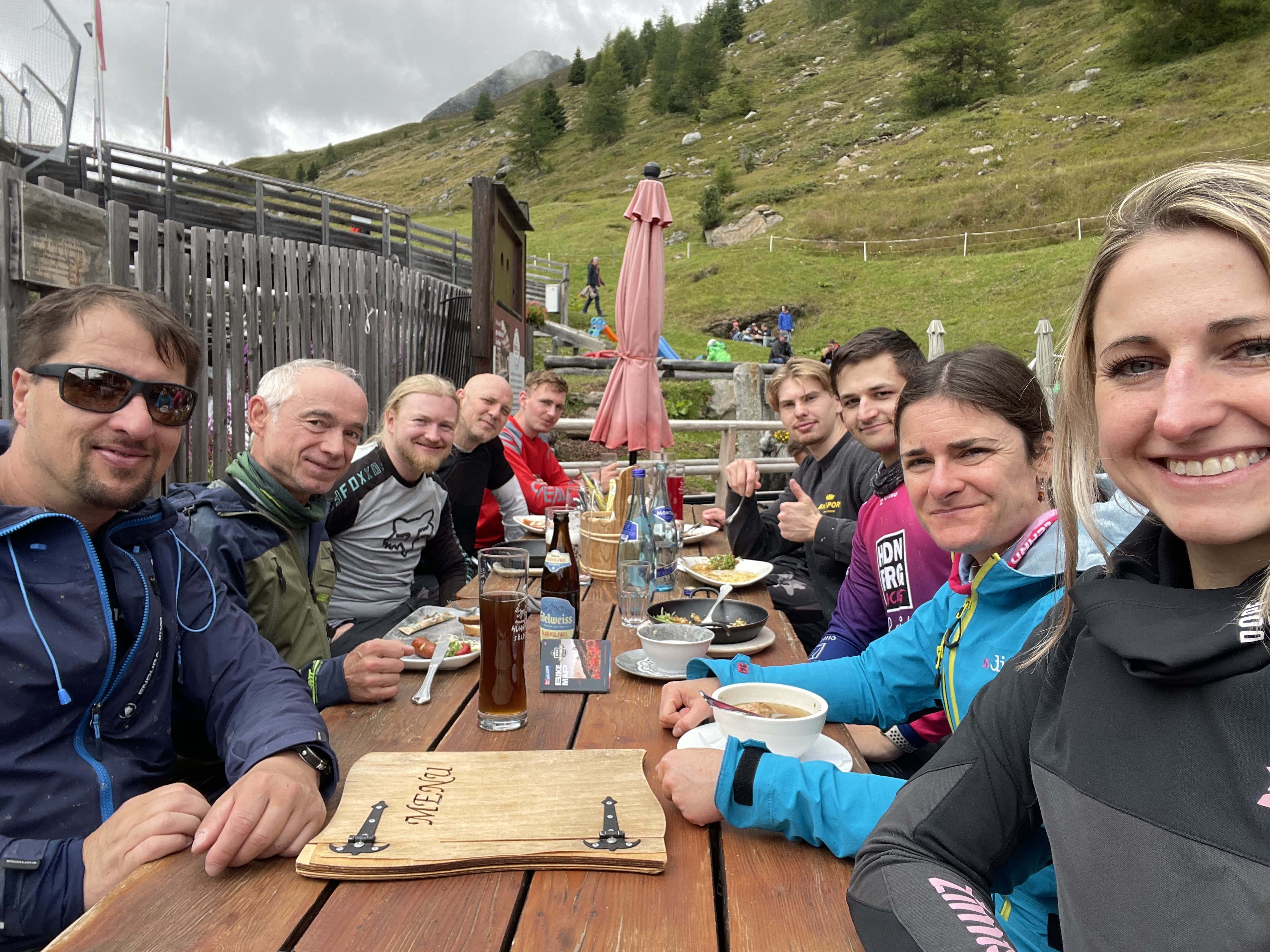 Zur Wochenmitte hin wurde das Wetter endlich besser und es konnte das Timmelsjoch (Grenzpass Österreich/Südtirol auf 2509 über N. N. in Angriff genommen werden. Die ersten Höhenmeter bis zur höchst gelegenen Gemeinde Österreichs, Obergurgl, Seehöhe von 1.930 Metern, ersparten wir uns und entschieden uns für den Linienbus von Sölden aus. Schließlich hieß es aber dann doch noch treten… 750 hm waren es bis zur Kaspressknödelsuppn, Weizen, Espresso und natürlich dem ersehnten Traileinstieg. Entlang des rauschenden Timmelsbachs, einer tollen Aussicht und einem Grinsen im Gesicht gings teils ganz schön ruppig und materialermüdend durch die ein oder andere S3/S4 Stelle zurück ins Tal, in die Pension. Während Oli mit seiner mobilen Werkstatt noch alle Hände voll zu tun hatte, die Bikes für den nächsten Tag fit zu machen, wuselten alle anderen um einen ordentlichen Grillabend auf die Beine zu stellen.