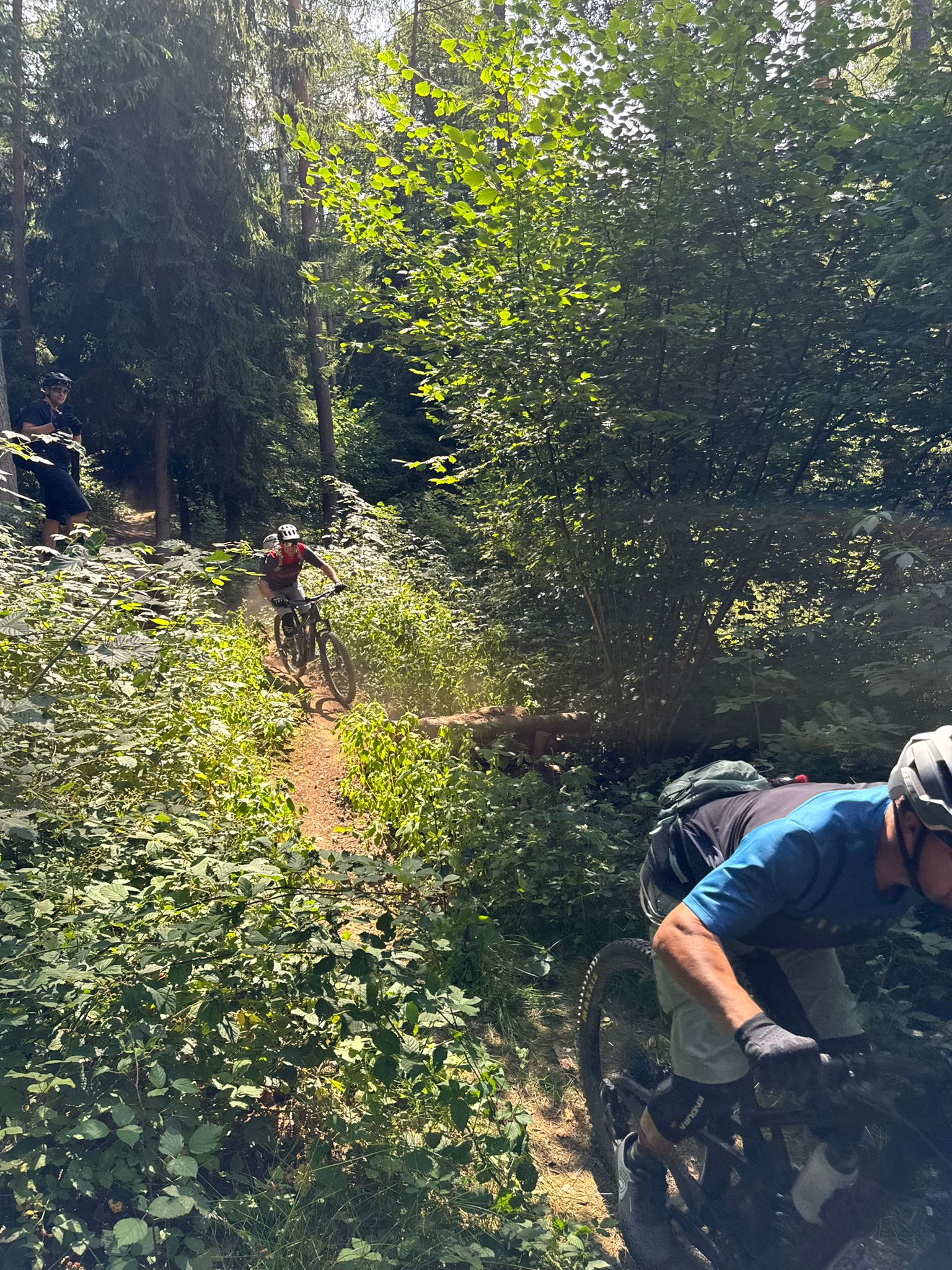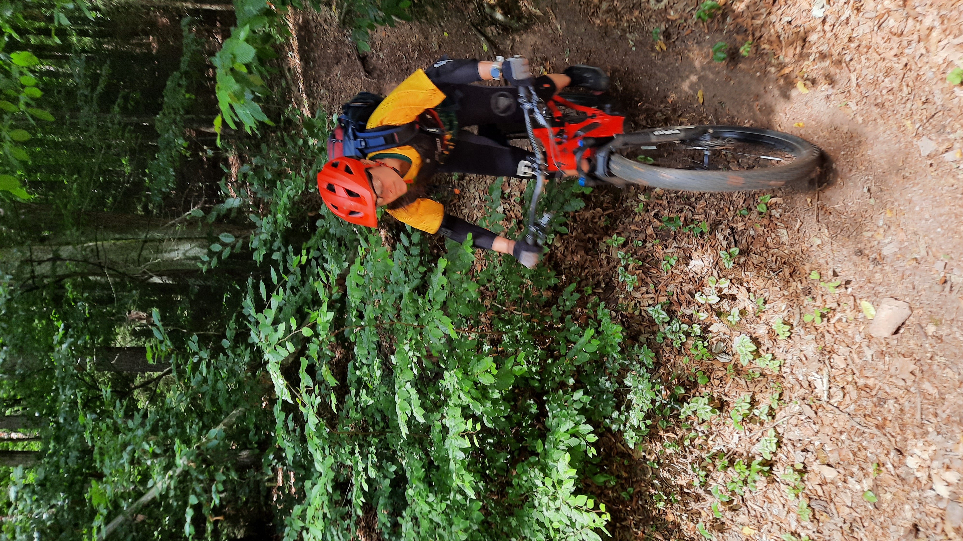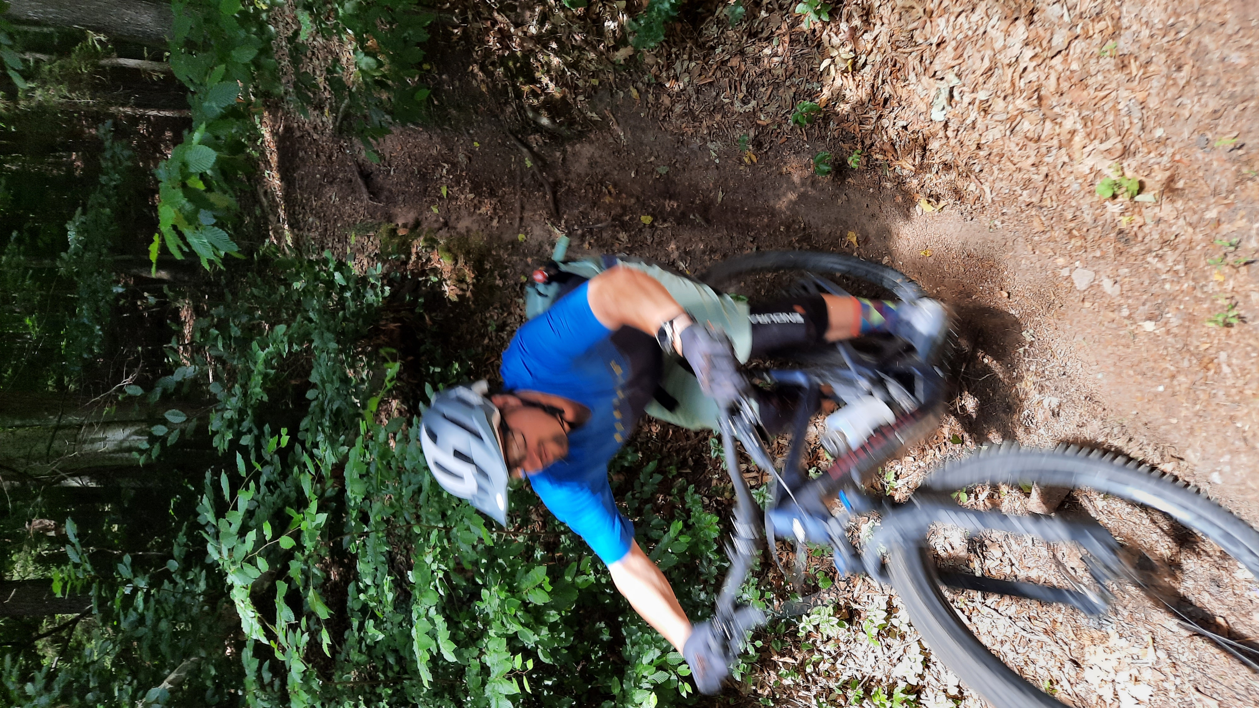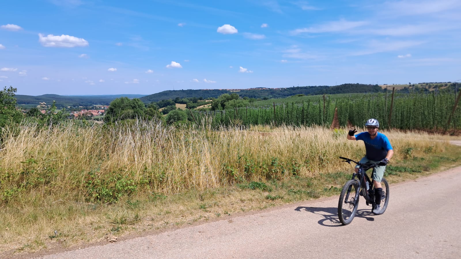 Als erstes fuhren wir zum Gipfelkreuz des Hörlberg. Nach unserer ersten Abfahrt ging es dann nach Güsseldorf durch die Massendorfer Schlucht nach Spalt. Für eine Einkehr noch zu früh führte uns der Weg weiter zur Bärenburg, eine frühzeitliche Befestigungsanlage oberhalb von Spalt. Ein Stück um die Feste und dann wieder nach unten kamen wir schließlich über die Stiegelmühle und Wernfels hoch nach Theilenberg. Von dort aus ging es dann an der ehemaligen Burganlage Theilenberg (eine Ausgrabungsstelle) vorbei durch den Wald über ehemalige Terassenanlagen ins Erlbachtal. Nun war die Zeit gekommen uns auf den Weg zurück nach Spalt zu machen um im Wittelsbacher Hof auf der Blechkärwa einzukehren. Schäuferle essen war der angepeilte Programmpunkt. Nach ausgiebiger Pause und sehr gutem Essen und Trinken fuhren wir wieder los, nach Schnittling. Dort entlang eines Weges am Schnittlinger Loch vorbei zur Abfahrt Hopfentrail. Wieder eine wunderbare Abfahrt. Anschließend zog es uns hoch nach Großweingarten. Die Abfahrt dort fanden wir so gut, dass wir gleich noch ein zweites mal hoch fuhren. Über 1000 hm waren nun erreicht und so ging es anschließend wieder zurück nach Georgengmünd wo wir die 54 km erreichten.