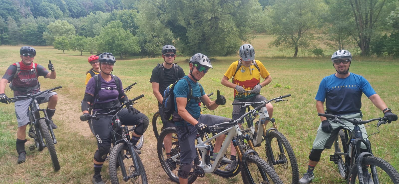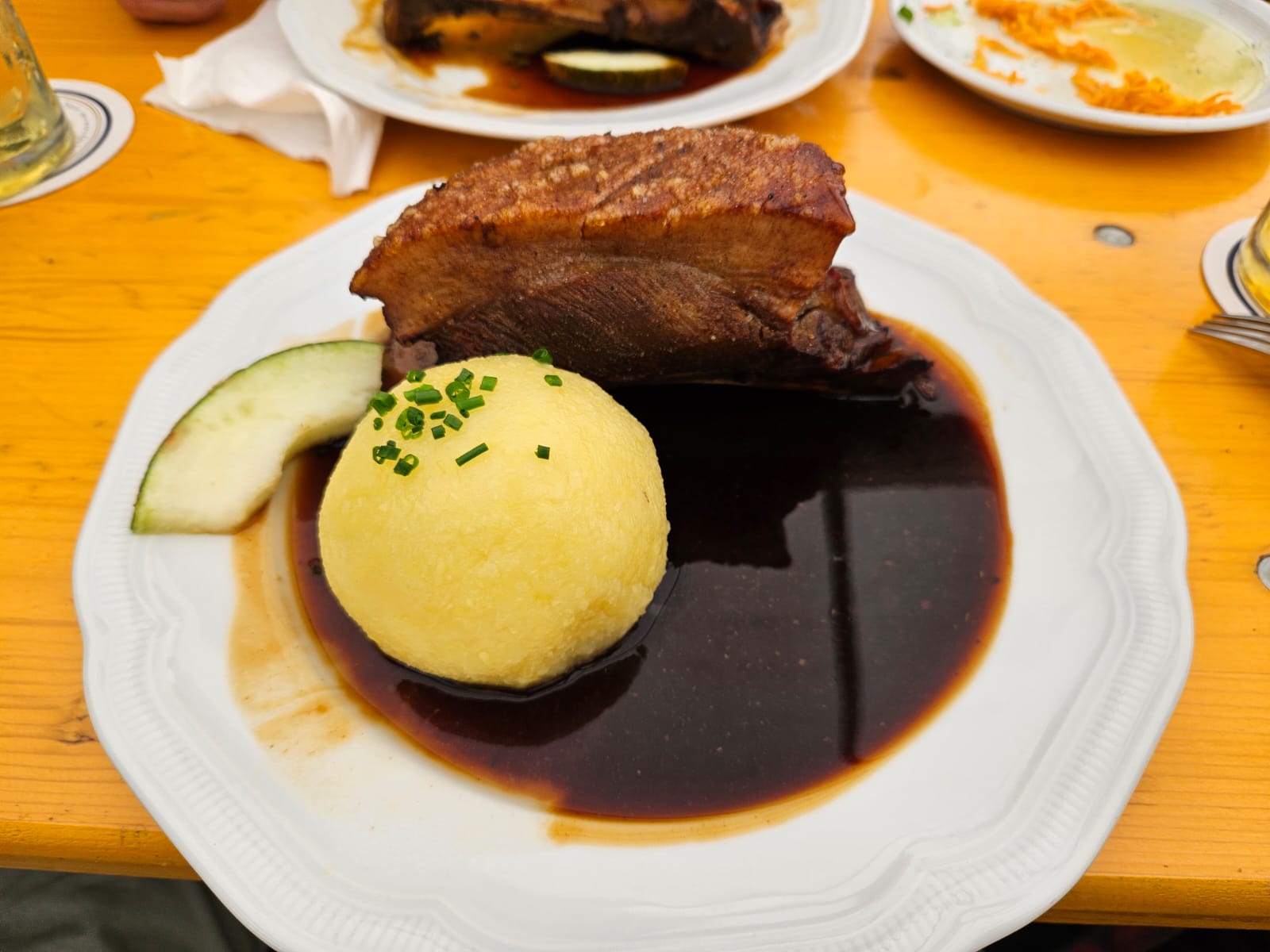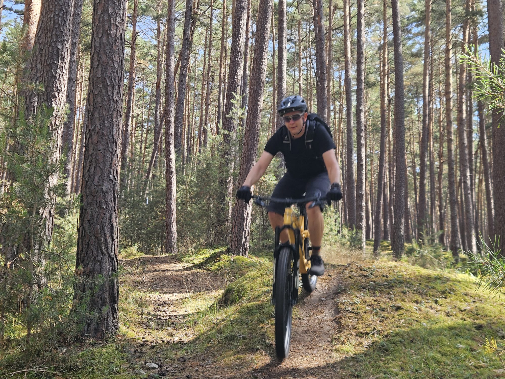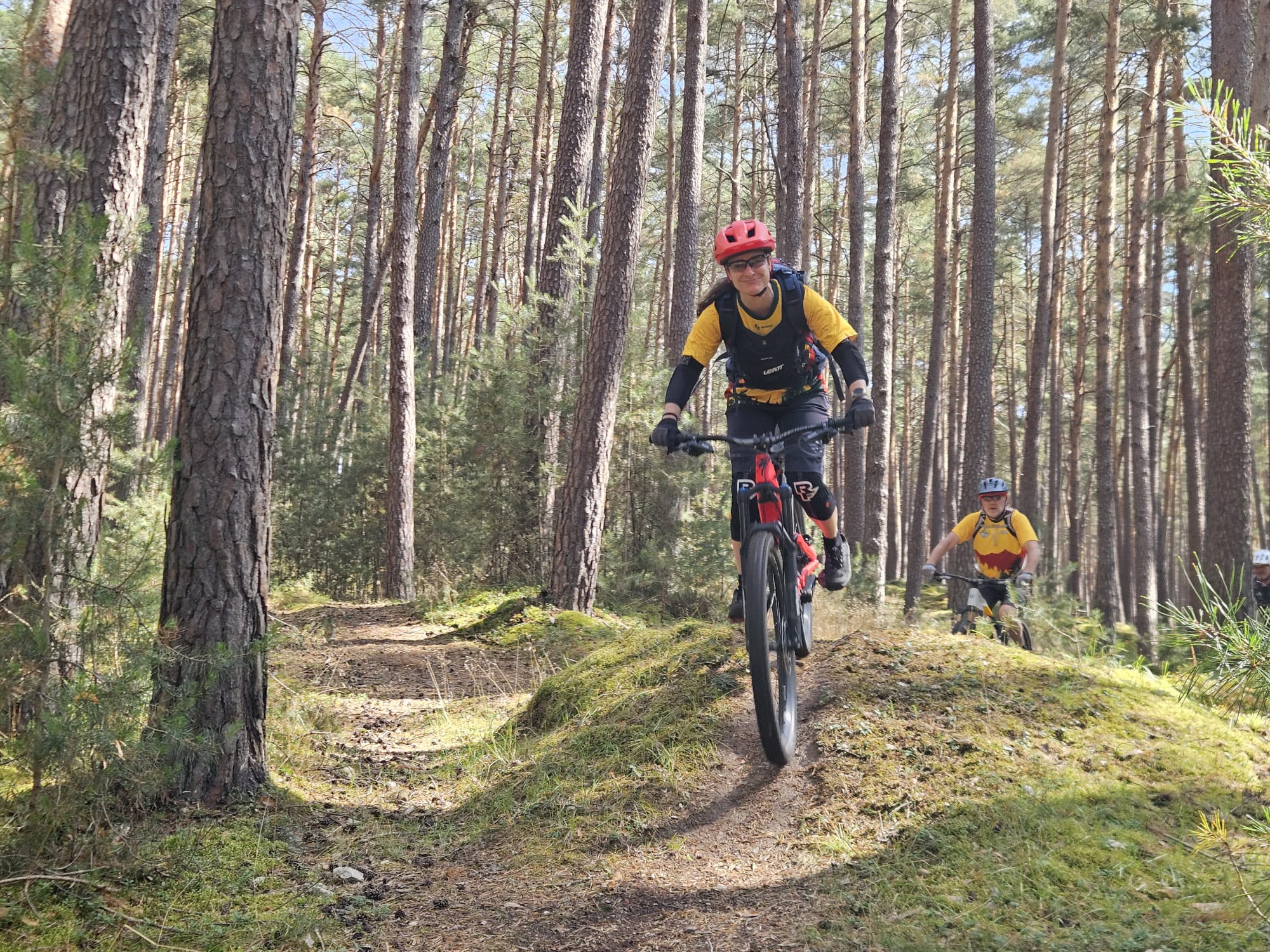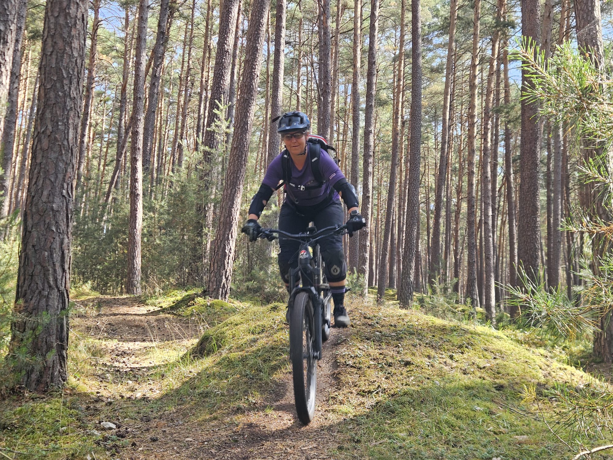 Als erstes fuhren wir zum Gipfelkreuz des Hörlberg. Nach unserer ersten Abfahrt ging es dann nach Güsseldorf durch die Massendorfer Schlucht nach Spalt. Für eine Einkehr noch zu früh führte uns der Weg weiter zur Bärenburg, eine frühzeitliche Befestigungsanlage oberhalb von Spalt. Ein Stück um die Feste und dann wieder nach unten kamen wir schließlich über die Stiegelmühle und Wernfels hoch nach Theilenberg. Von dort aus ging es dann an der ehemaligen Burganlage Theilenberg (eine Ausgrabungsstelle) vorbei durch den Wald über ehemalige Terassenanlagen ins Erlbachtal. Nun war die Zeit gekommen uns auf den Weg zurück nach Spalt zu machen um im Wittelsbacher Hof auf der Blechkärwa einzukehren. Schäuferle essen war der angepeilte Programmpunkt. Nach ausgiebiger Pause und sehr gutem Essen und Trinken fuhren wir wieder los, nach Schnittling. Dort entlang eines Weges am Schnittlinger Loch vorbei zur Abfahrt Hopfentrail. Wieder eine wunderbare Abfahrt. Anschließend zog es uns hoch nach Großweingarten. Die Abfahrt dort fanden wir so gut, dass wir gleich noch ein zweites mal hoch fuhren. Über 1000 hm waren nun erreicht und so ging es anschließend wieder zurück nach Georgengmünd wo wir die 54 km erreichten.