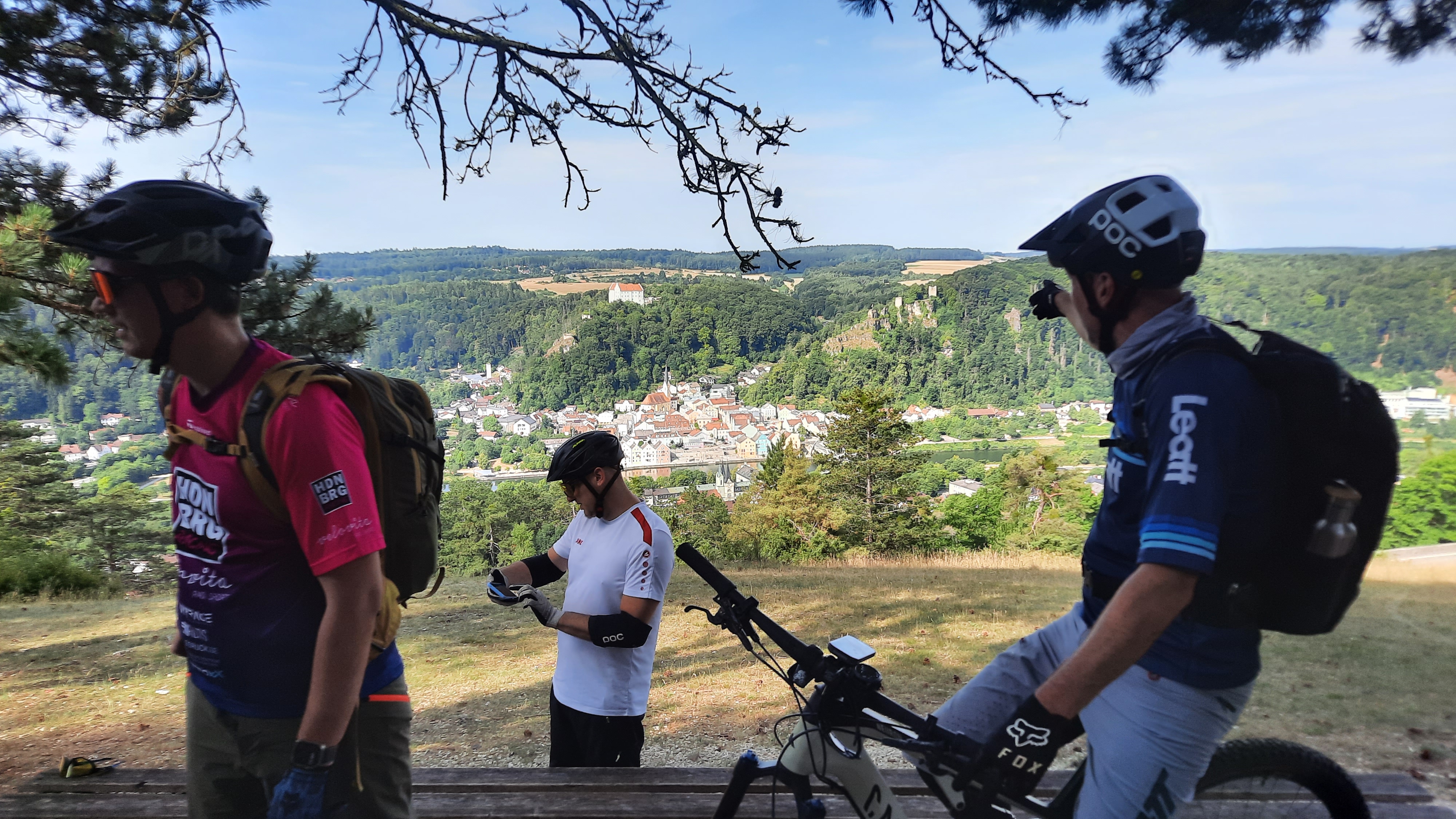 Nach einer kurzen Stärkung mit Kaffee und Kuchen ging es über div. neue Strecken, den neuen „Kelheim Trails“, ins Tal zurück, vorbei an der Tropfsteinhöhle Schulerloch, zu einem knackigen Anstieg nach Kelheim. Vor dem nächsten abwechslungsreichen Downhill nach unten bot sich uns noch ein majestätischer Anblick auf die Stadt und die Befreiungshalle.