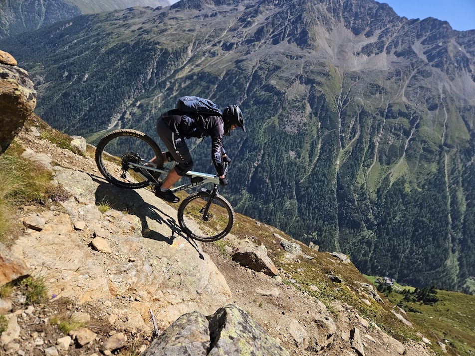 Als letztes Highlight der Woche stand noch der Fernar-Tail mit einer grandiosen Aussicht auf den Tiefenbachgletscher an. Das tiefschwarze Spektakel welches viel technisches Geschick und hohe Konzentration voraussetzt startet auf 2.800 Meter über N. N., führt extrem steil, über zahlreiche Spitzkehren und verblockten Stellen S4/S5 und entließ uns unversehrt wieder im Bikepark zur gemütlichen Einkehr, bevor die letzten Trails der Woche unsicher gemacht wurden.